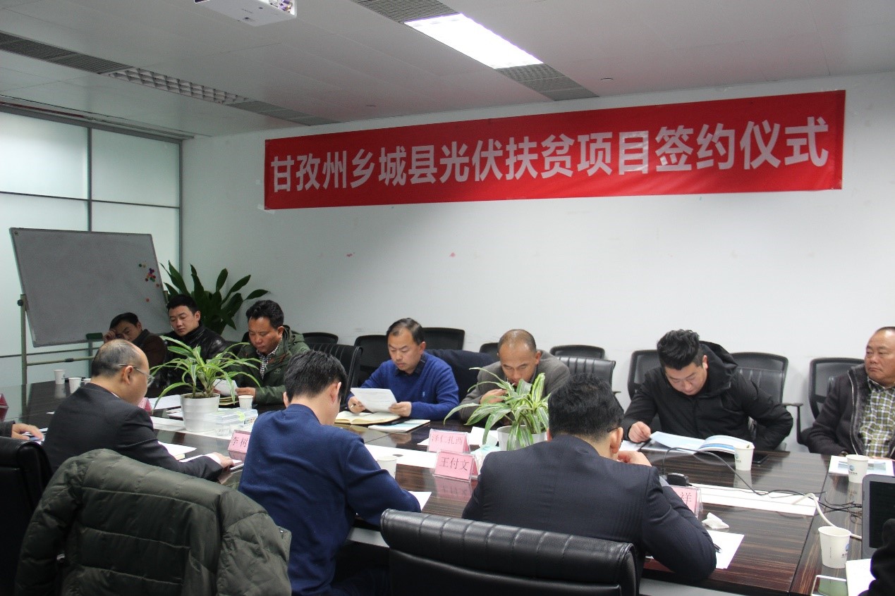 在签约仪式上,乡城县协调办主任泽仁扎西首先向与会企业介绍了乡城光伏扶贫项目的整体情况。他指出,乡城县光伏扶贫项目是县政府打赢脱贫攻坚战的重要举措,是地方产业扶贫的具体措施,希望各方本着合作共赢、互利互惠的原则扎实推进光伏扶贫项目。随后,公司总经理李树成就公司在乡城县的光伏扶贫项目进行了汇报。乡城光伏扶贫项目是公司开发的首批光伏扶贫项目之一,在产业带动、地方扶贫、环境保护等方面将发挥积极有效的作用。公司将加快项目前期各项工作,力争早日开工建设,早日并网投产,早日发挥社会经济效益。联合光伏等光伏企业也对项目进展情况进行了汇报。