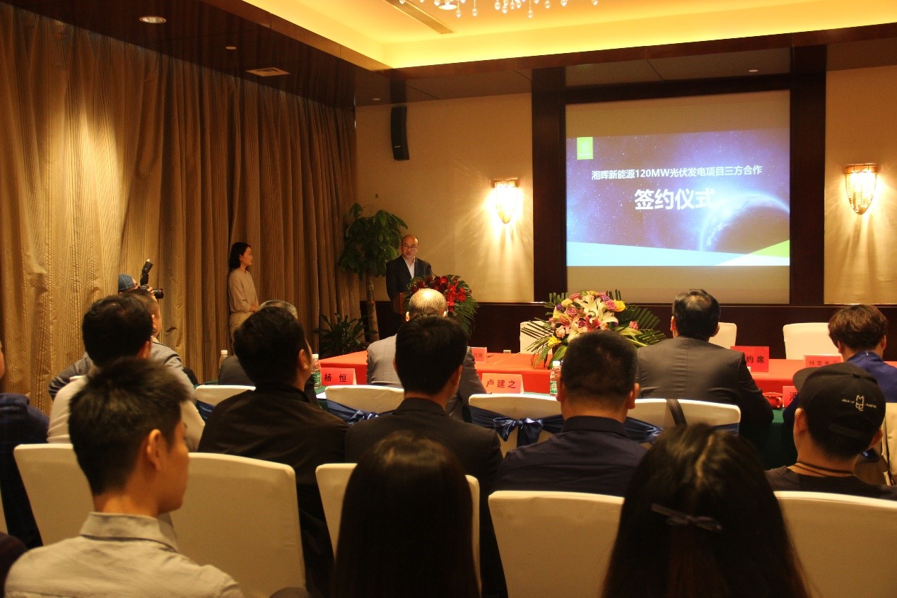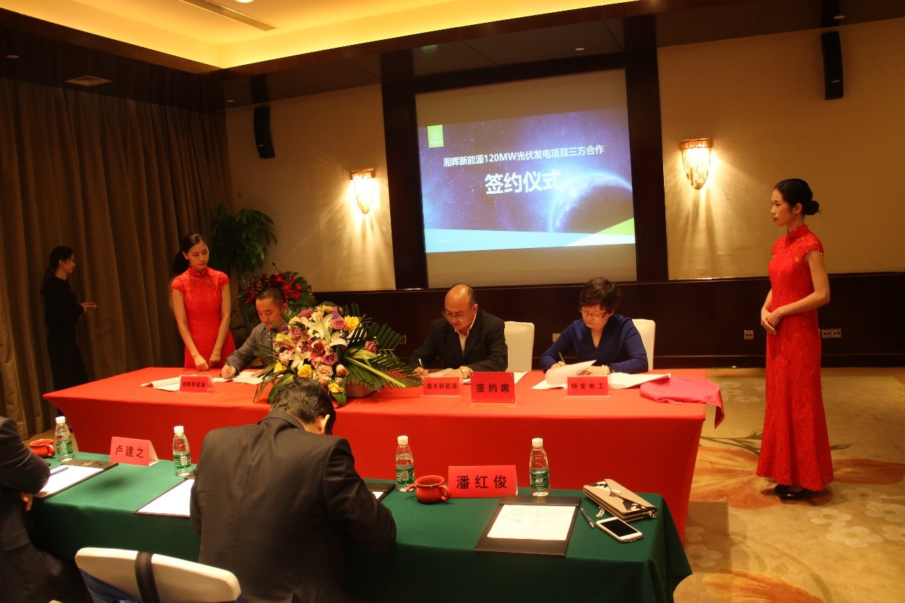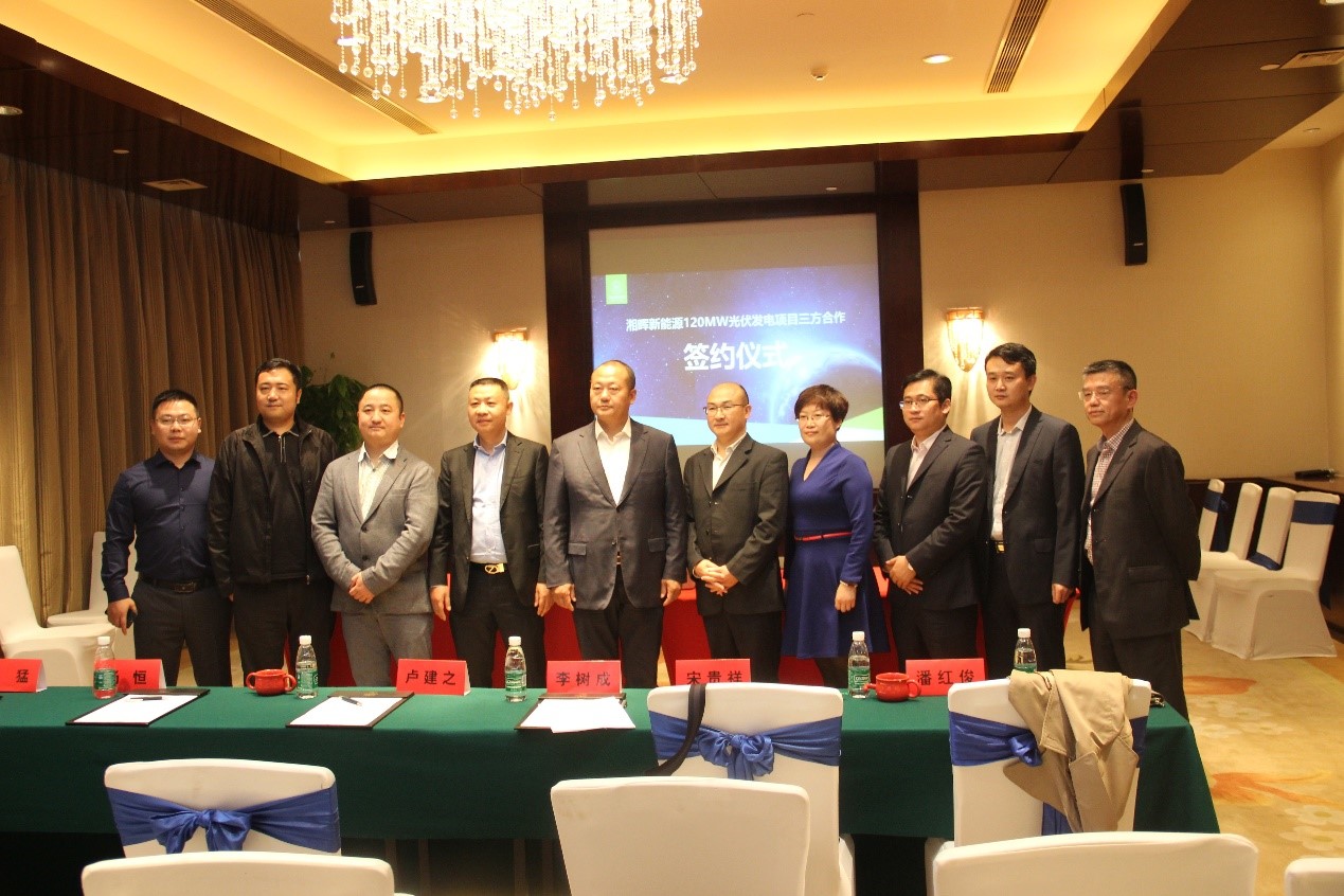 10月29日,湖南120MW光伏发电项目三方合作签约仪式在长沙市隆重举行,公司总经理李树成、财务总监宋贵祥,特变电工新疆新能源副总经理潘红俊,华民资本集团董事长卢建之,湘晖新能源董事长熊猛、总经理张家林等领导出席仪式。
